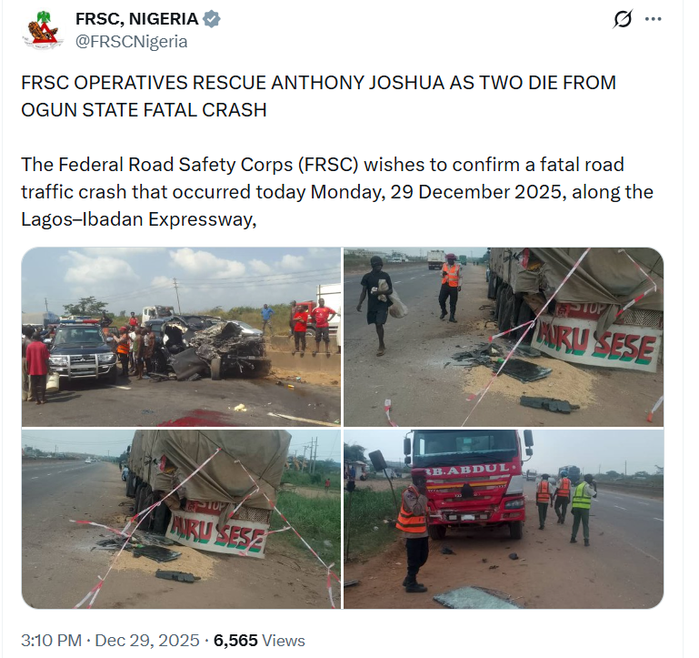 Police in Ogun State confirmed to the BBC that Joshua suffered minor injuries and is “fine.” The 36 year old boxer has family roots in Sagamu, and was reportedly traveling along the Ogun–Lagos Expressway when the accident occurred.