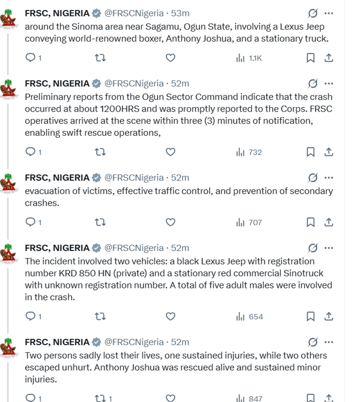For now, the focus remains on the victims, the investigation, and the fact that Anthony Joshua is fortunate to have escaped with minor injuries.
