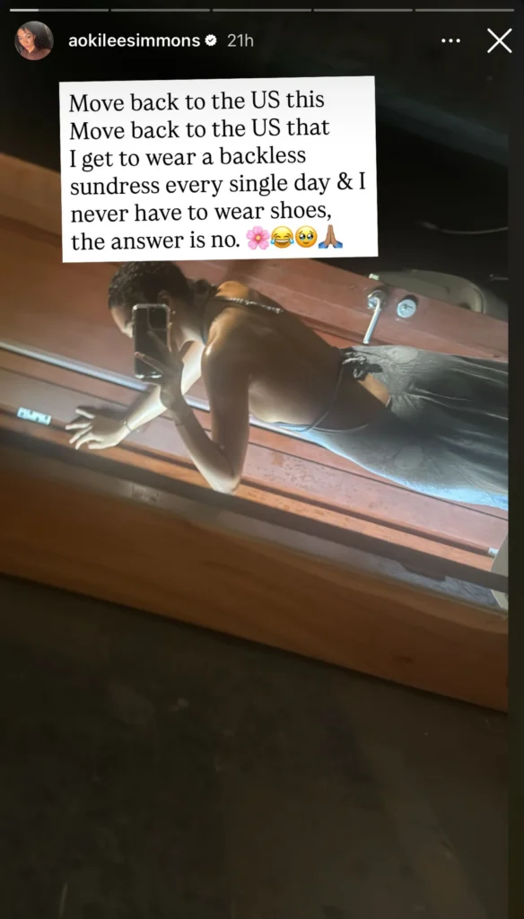 “Move back to the US this. Move back to the US that,” she wrote. “I get to wear a backless sundress every single day & I never have to wear shoes, the answer is no.”