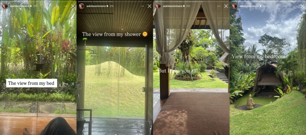 In the stories, Aoki showed off breathtaking views from what appears to be a luxury home or resort. One shot showed lush greenery visible from her bed. Another was taken from her shower, opening up to a tropical outdoor scene. She ended the series with a soft caption that read, “But I miss you all.”