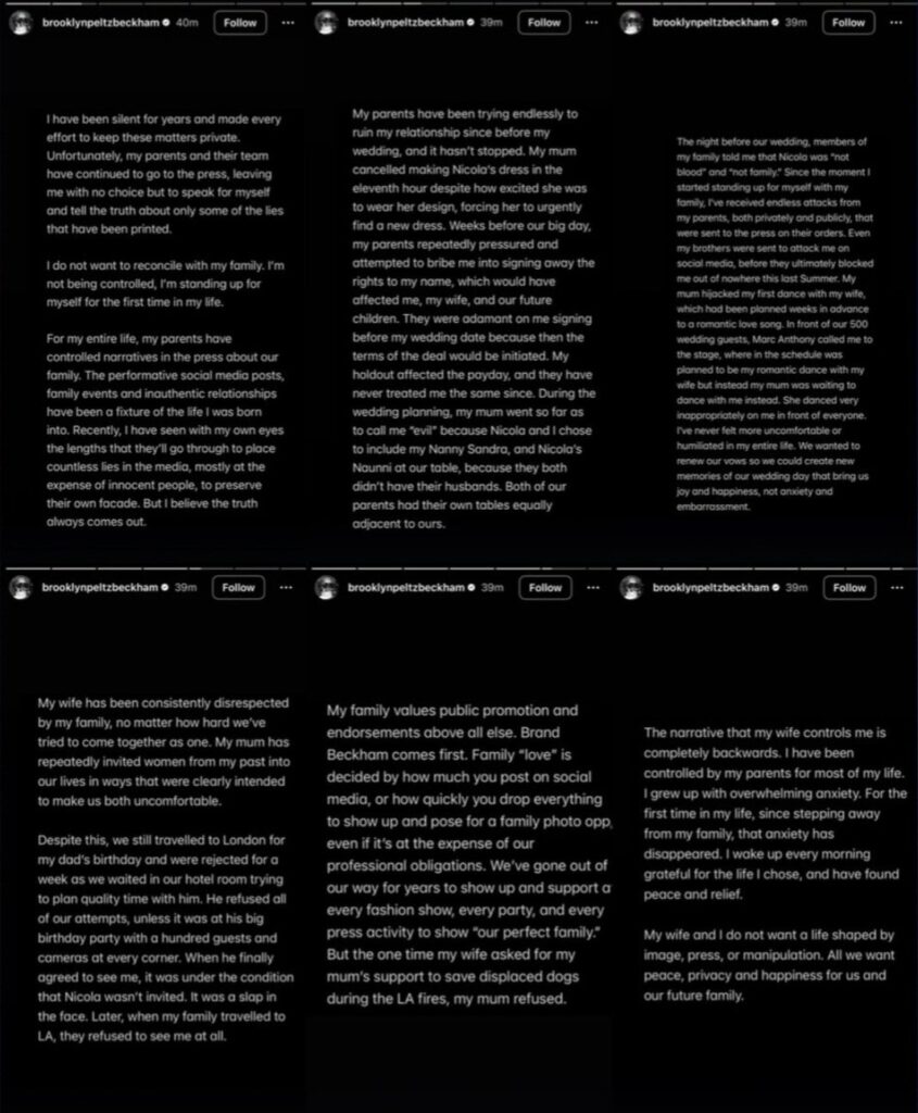 Brooklyn also confirmed a widely reported wedding incident involving Marc Anthony, saying a planned romantic dance with Nicola turned uncomfortable. “My mum was waiting to dance with me,” he wrote. “I’ve never felt more humiliated.”