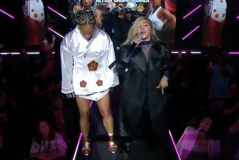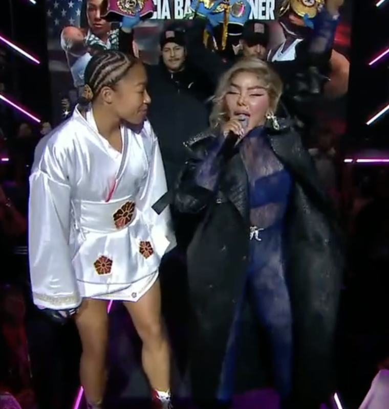 Alycia brought out her favorite artist and longtime friend, the legendary Lil’ Kim, to walk her to the ring. And honey, the “Queen Bee” did not come to play! Rocking a custom designer look that probably cost more than the ringside seats, Kim rapped her iconic hits while Alycia strutted to the ring at the Theater at Madison Square Garden. But once the gloves were on, the conversation quickly shifted from the boxing to the “botox”—and beyond!