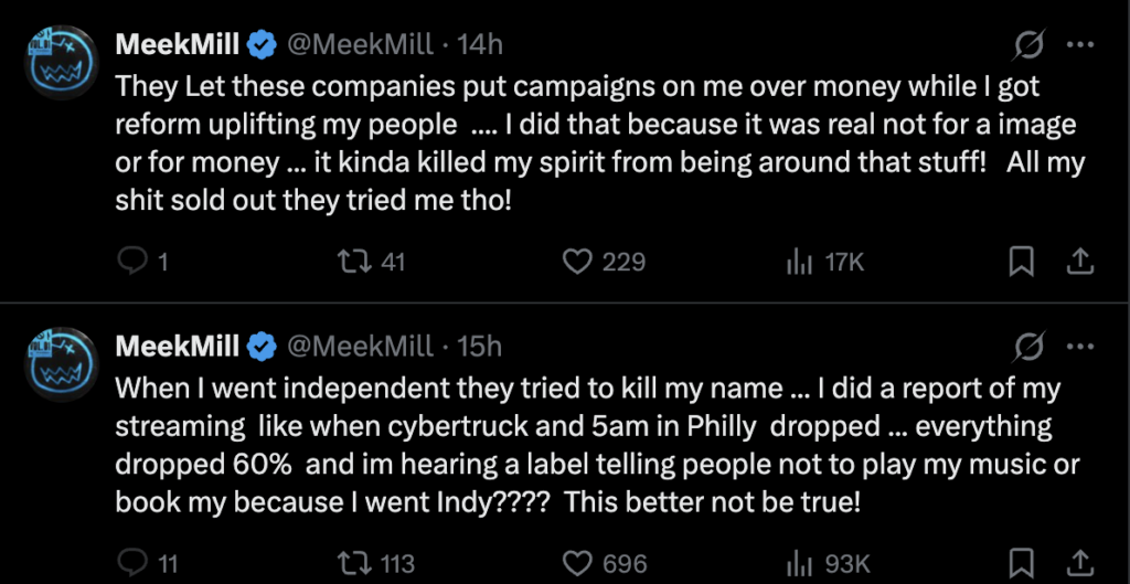 Meek also claimed he had heard that a label may be discouraging industry partners from supporting him.