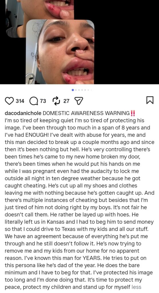 Rice’s ex-girlfriend, Dacoda Nichole, posted photos showing visible bruising and damage inside a home, alongside a lengthy caption describing a long pattern of mistreatment. She did not identify Rice by name in the post.