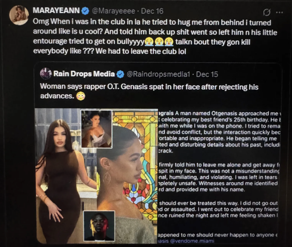 Maraye Alexander became the third woman to speak out after reposting an earlier allegation on December 16 and sharing her own account. Her post followed stories from beauty specialist Isabella Grais and model Naudia Donald, who have both described troubling encounters with the Long Beach rapper. O.T. Genasis and his representatives have not commented on the allegations.